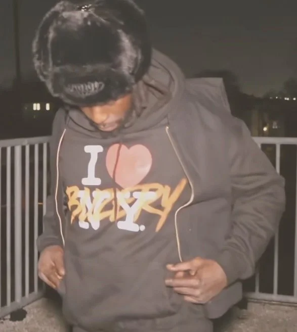 🧥 Blizery wearing his signature “I ❤️ Blizery” design — reclaiming identity and embedding personal legacy into cultural symbolism.