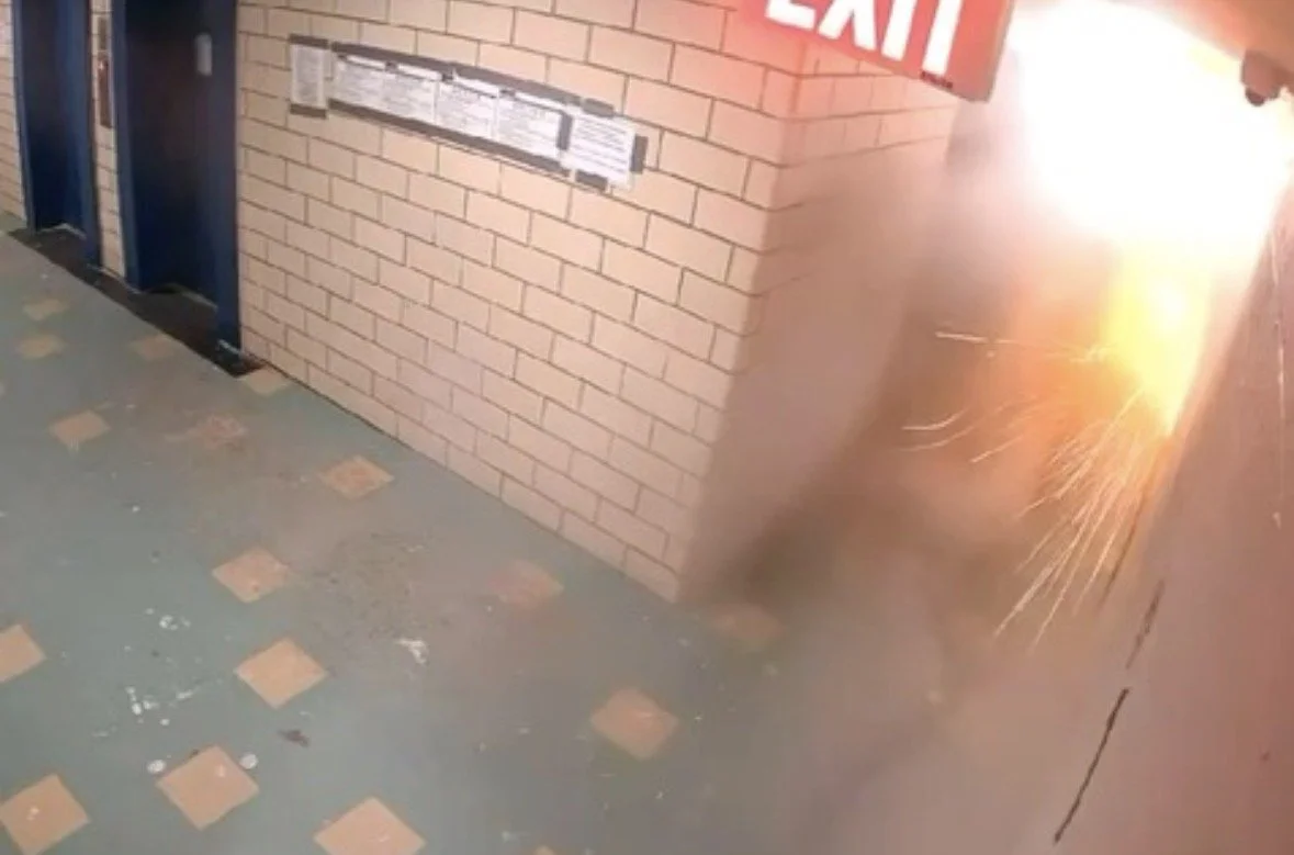 Security camera footage shows a sudden burst of flame ripping through an interior hallway, sending sparks, debris, and fire through the exit corridor.