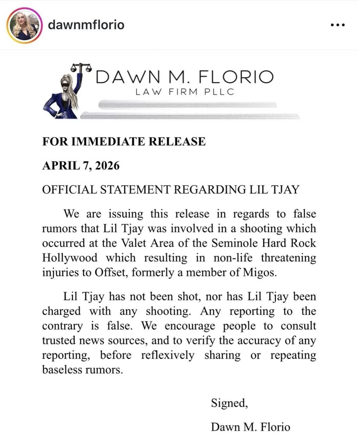 π Official statement from attorney Dawn Florio denying shooting involvement