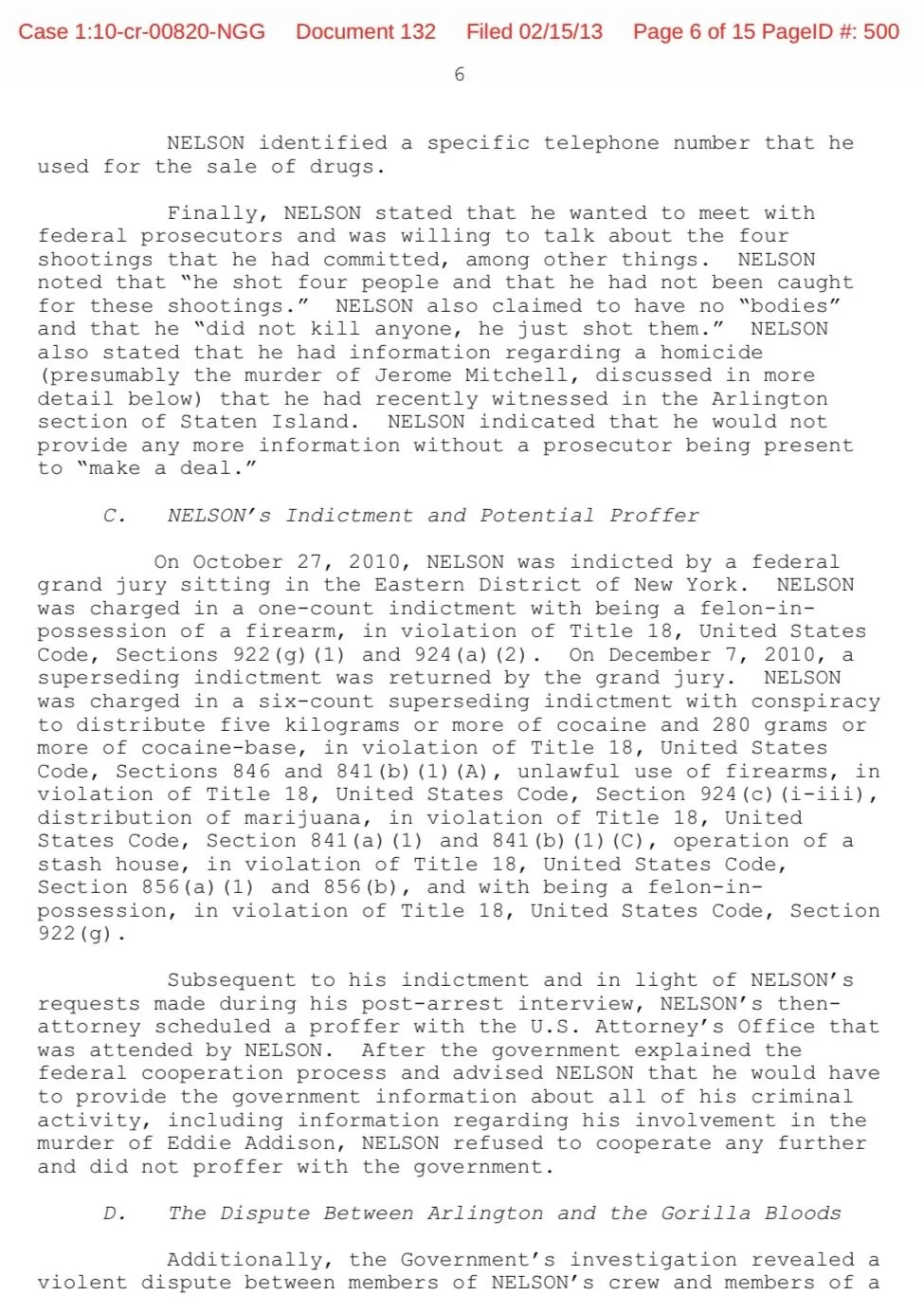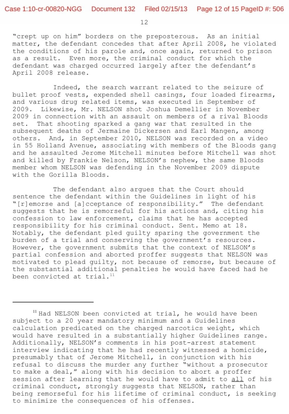 The memo also confirms that on November 7, 2009, during a confrontation between members of the Arlington crew and the Gorilla Bloods, Nelson drew a firearm and shot Joshua “S-Rilla” Demellier in the lower back.