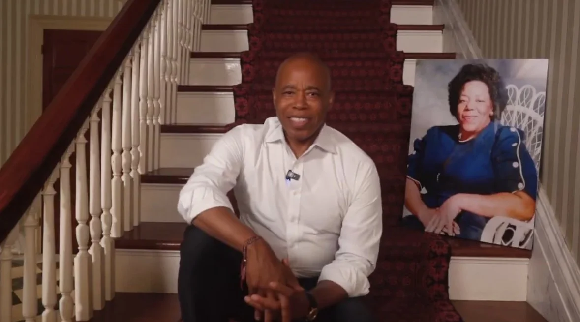 📸➡️ Eric Adams sitting on the staircase, delivering the video message announcing his withdrawal from the race.