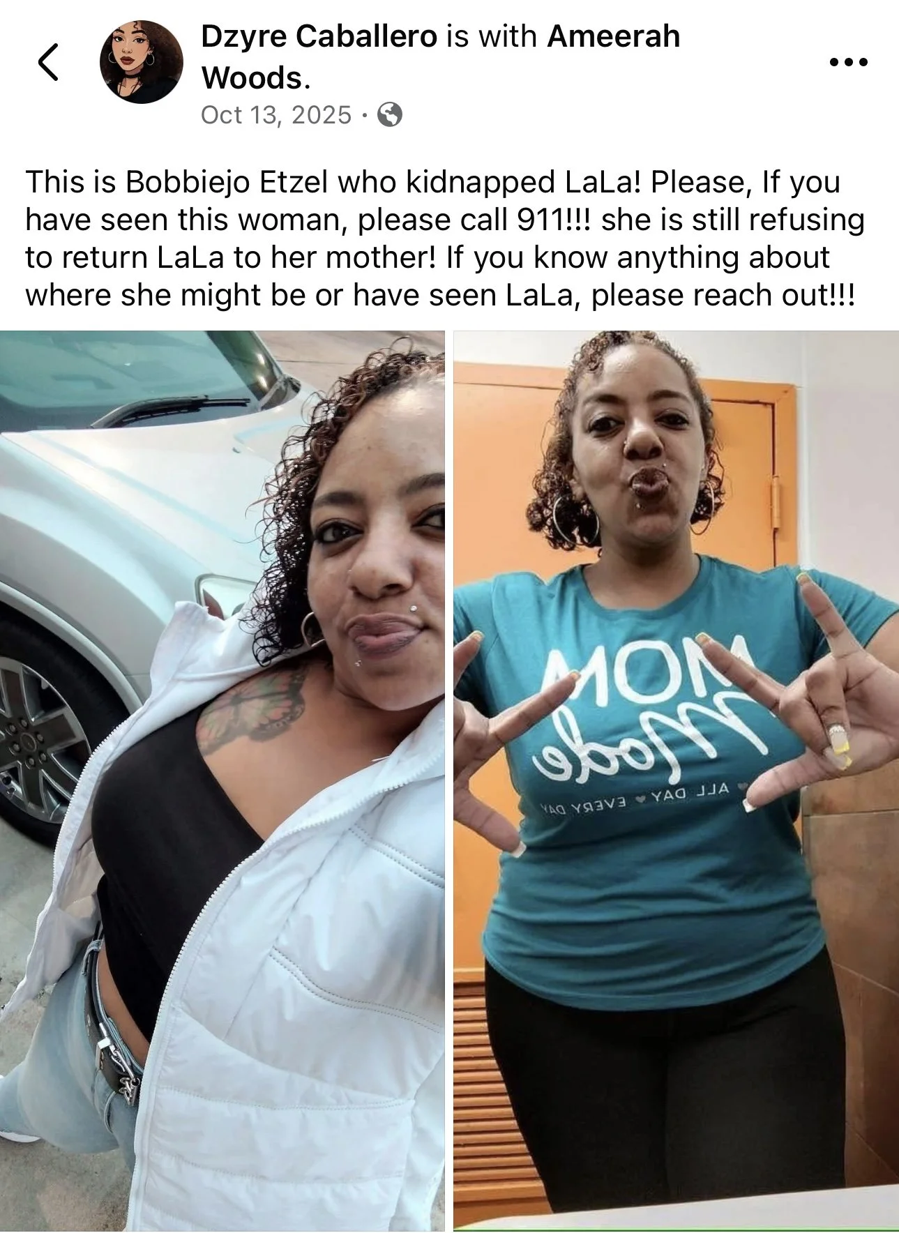 📱 Public post accusing Bobbiejo Etzel of refusing to return LaLa.