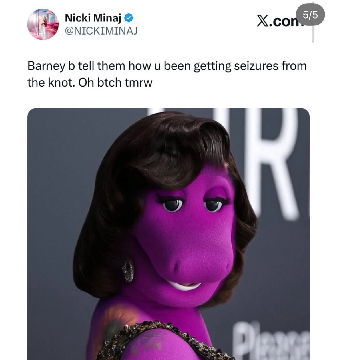 🟣 “Barney B tell them how you been getting seizures from the knot” — Nicki posts an AI meme turning Cardi into a purple dinosaur caricature.