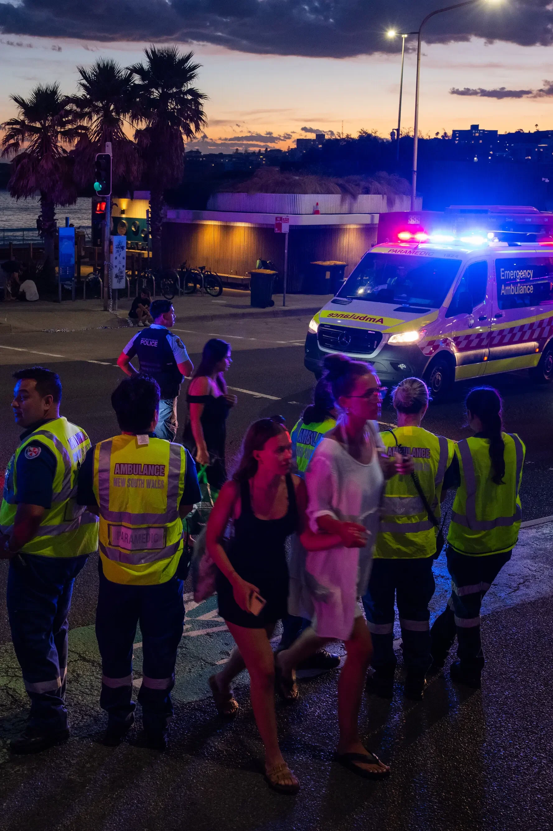 🚑 First responders move victims away from the scene as emergency lights flood the beachfront
