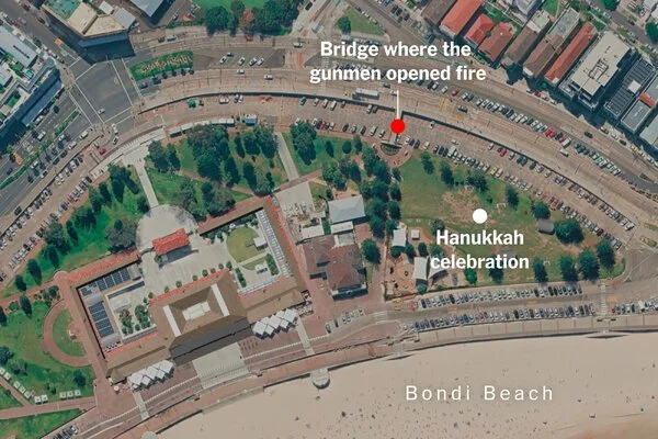 📍 Aerial view shows the proximity between the gunfire and the Hanukkah celebration area